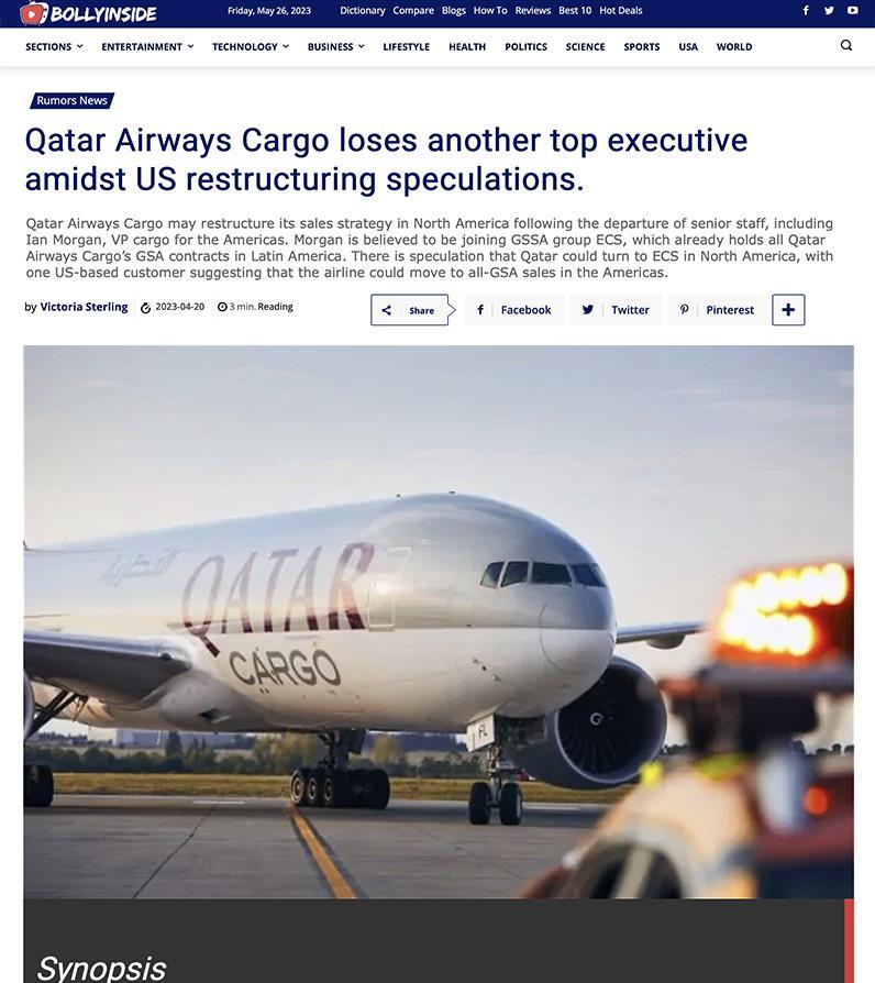 20 April 2023 READ THE ARTICLE US restructure rumours as another top exec quits Qatar Airways Cargo
