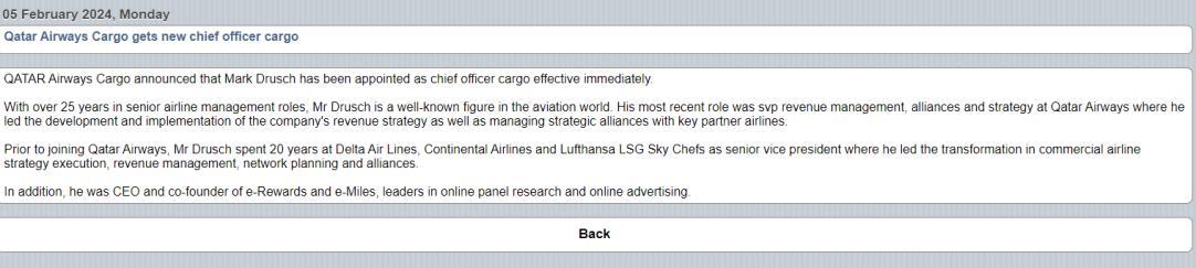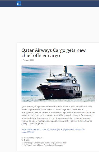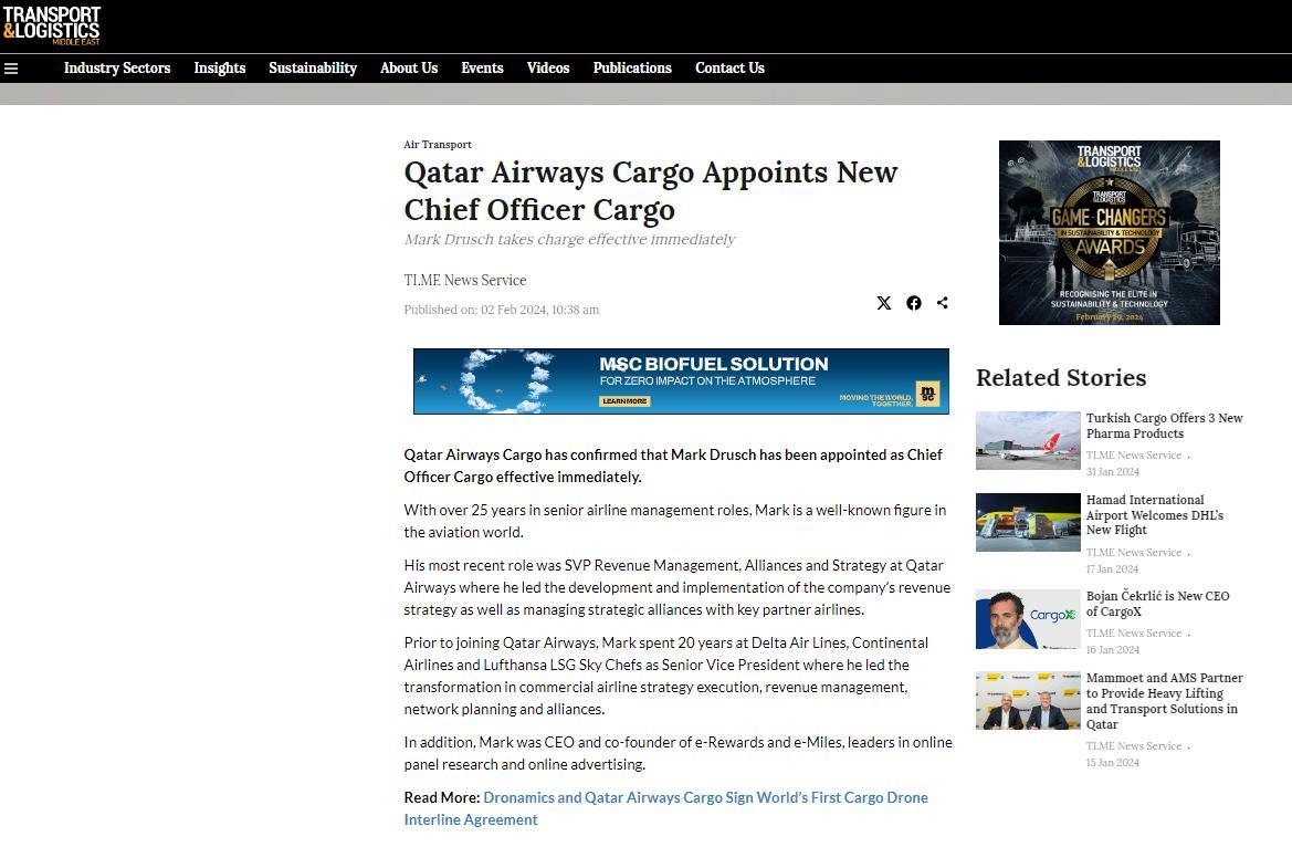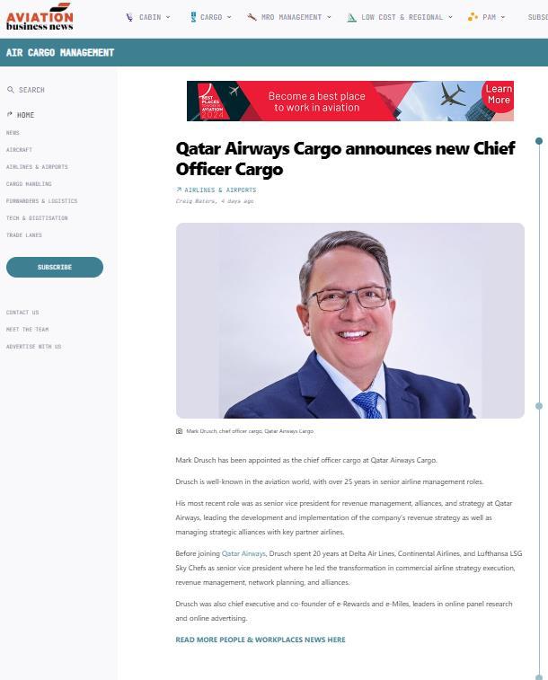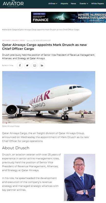 QATAR AIRWAYS CARGO NAMES MARK DRUSCH AS CHIEF OFFICER CARGO 31 JANUARY 2024 READ THE ARTICLE