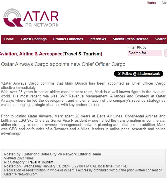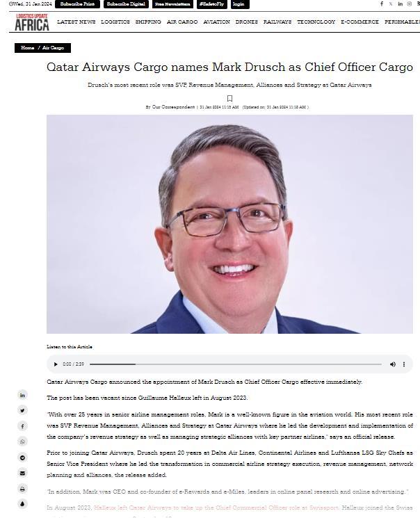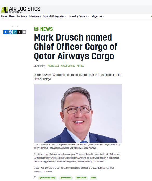 QATAR AIRWAYS CARGO NAMES MARK DRUSCH AS CHIEF OFFICER CARGO READ THE ARTICLE 31 JANUARY 2024