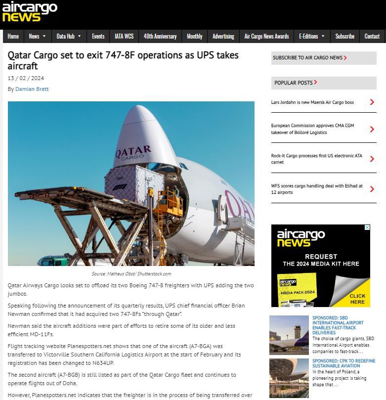 QATAR CARGO SET TO EXIT 747-8F OPERATIONS AS UPS TAKES AIRCRAFT 13 FEBRUARY 2024 READ THE ARTICLE