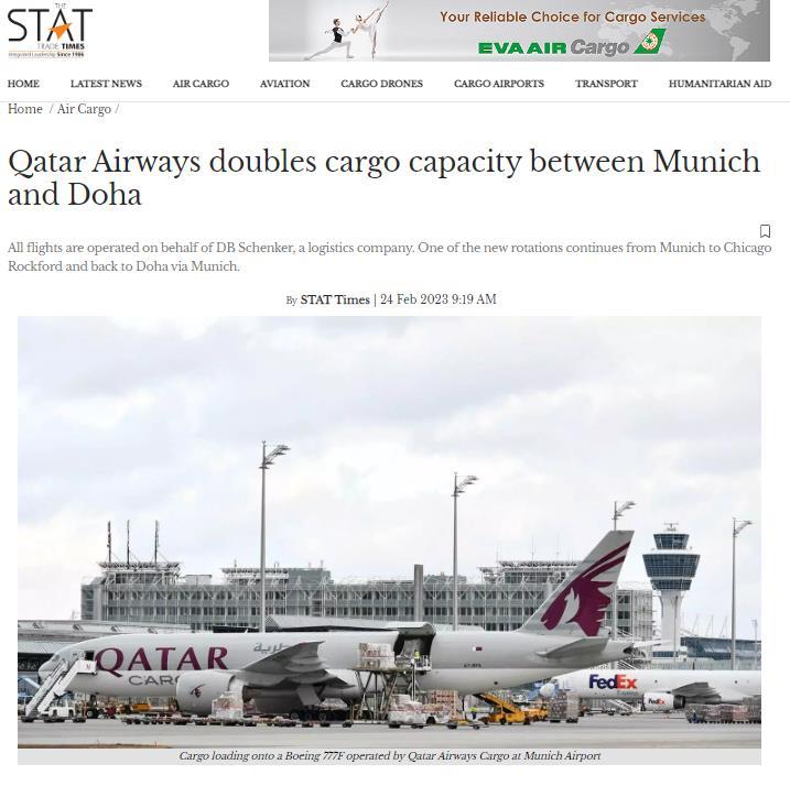 24 February 2023 READ THE ARTICLE Qatar Airways doubles cargo capacity between Munich and Doha