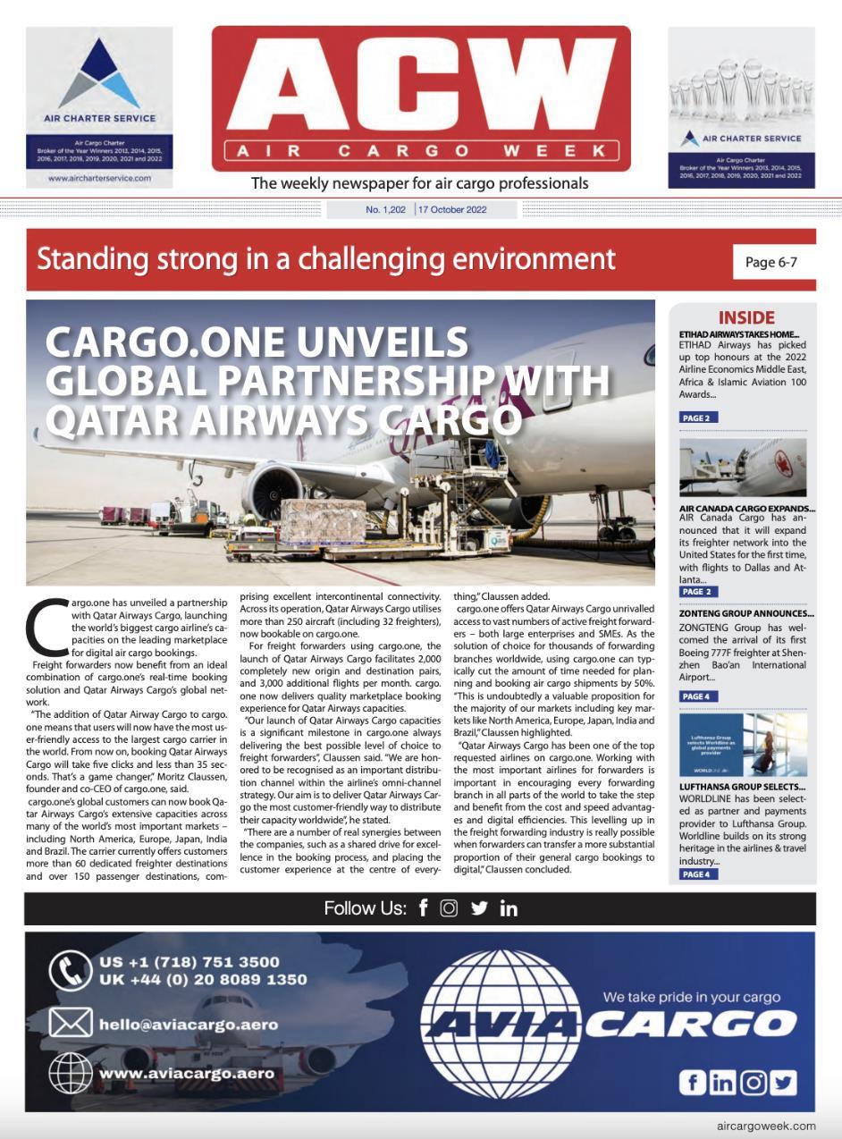 18 October 2022 READ THE ARTICLE “Significant milestone” for cargo.one as Qatar Airways Cargo joins digital booking platform