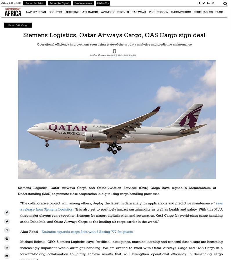 17 October 2022 READ THE ARTICLE Siemens Logistics, Qatar Airways Cargo, QAS Cargo sign deal