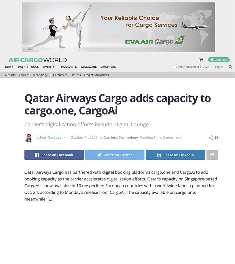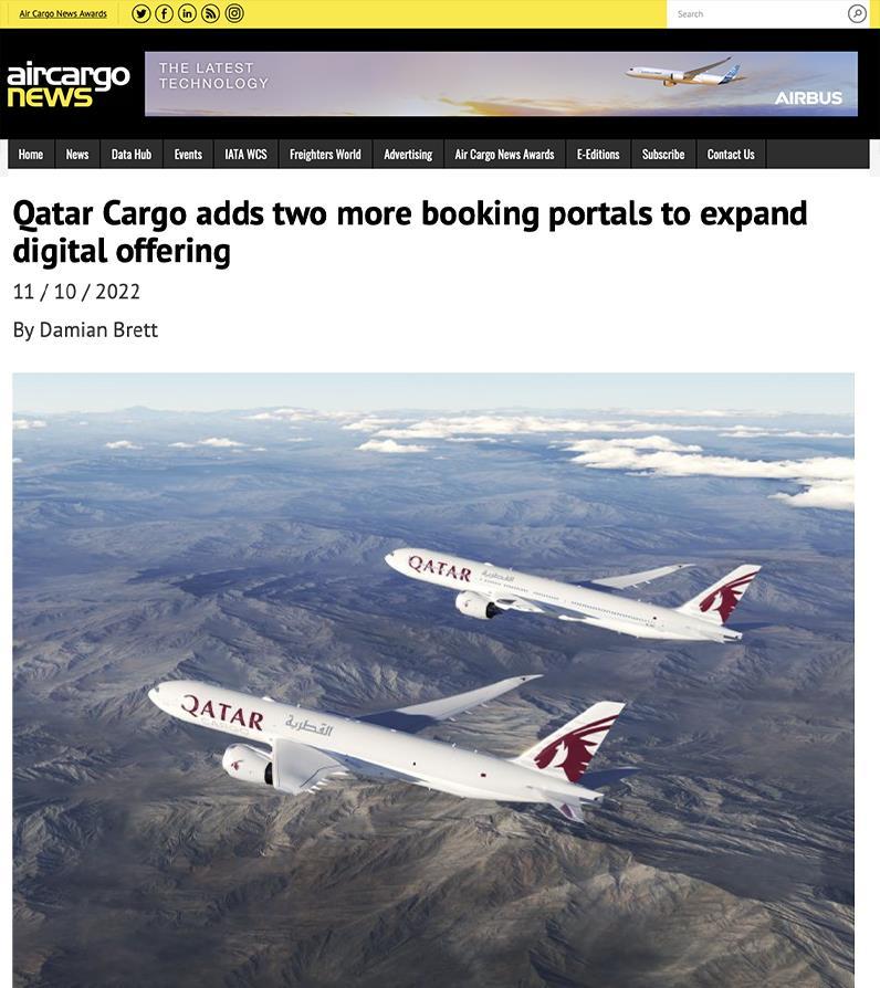 12 October 2022 READ THE ARTICLE Qatar Airways Cargo on two digital platforms