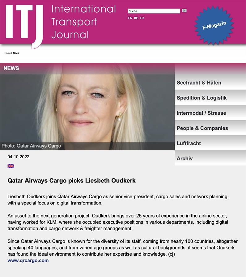 October 2022 READ THE ARTICLE Liesbeth Oudkerk joins Qatar Airways Cargo as SVP, Cargo Sales and Network Planning Page 43