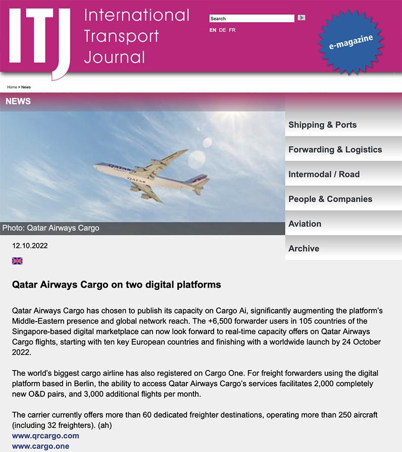 11 October 2022 READ THE ARTICLE Qatar Cargo signs Cargo.one for online booking