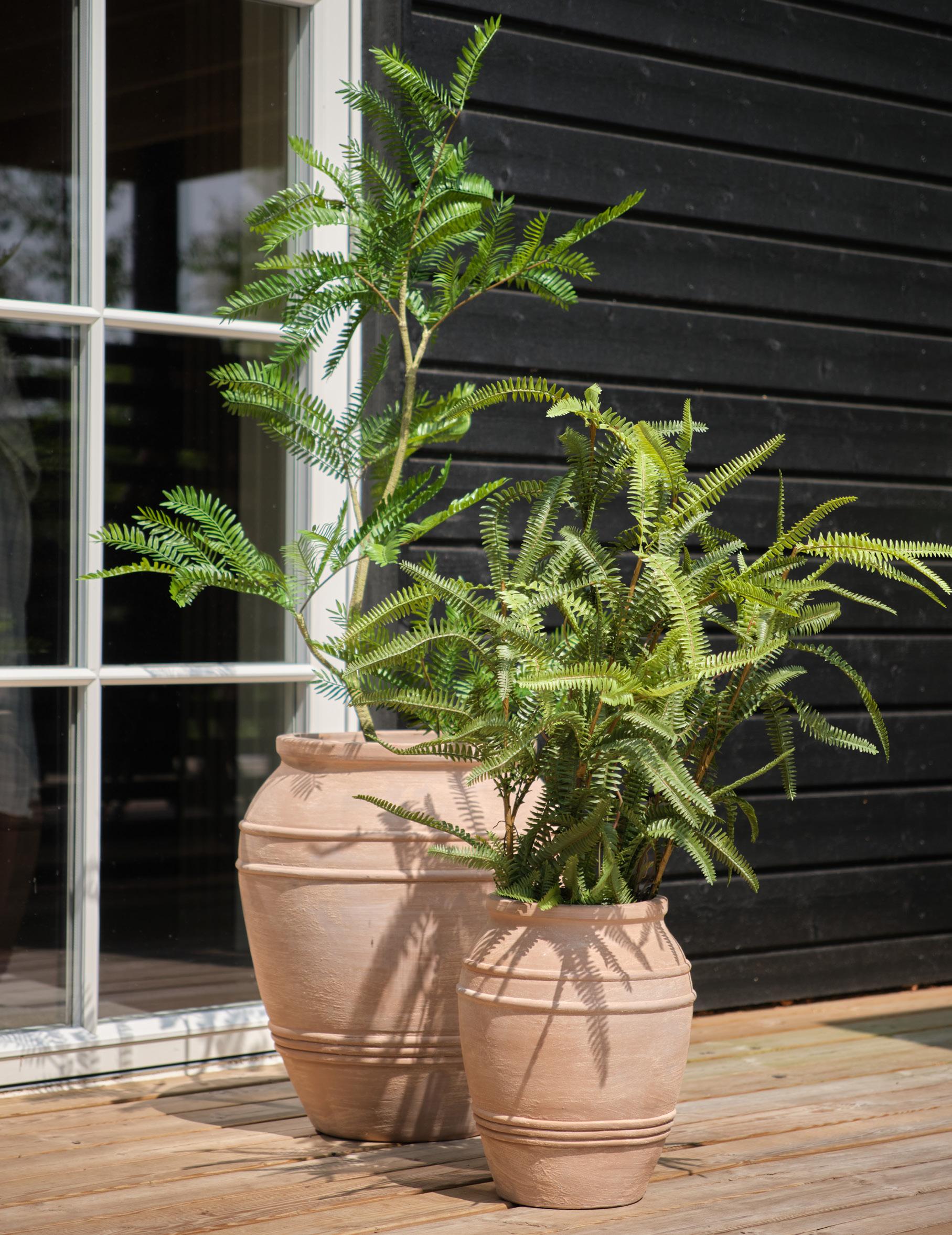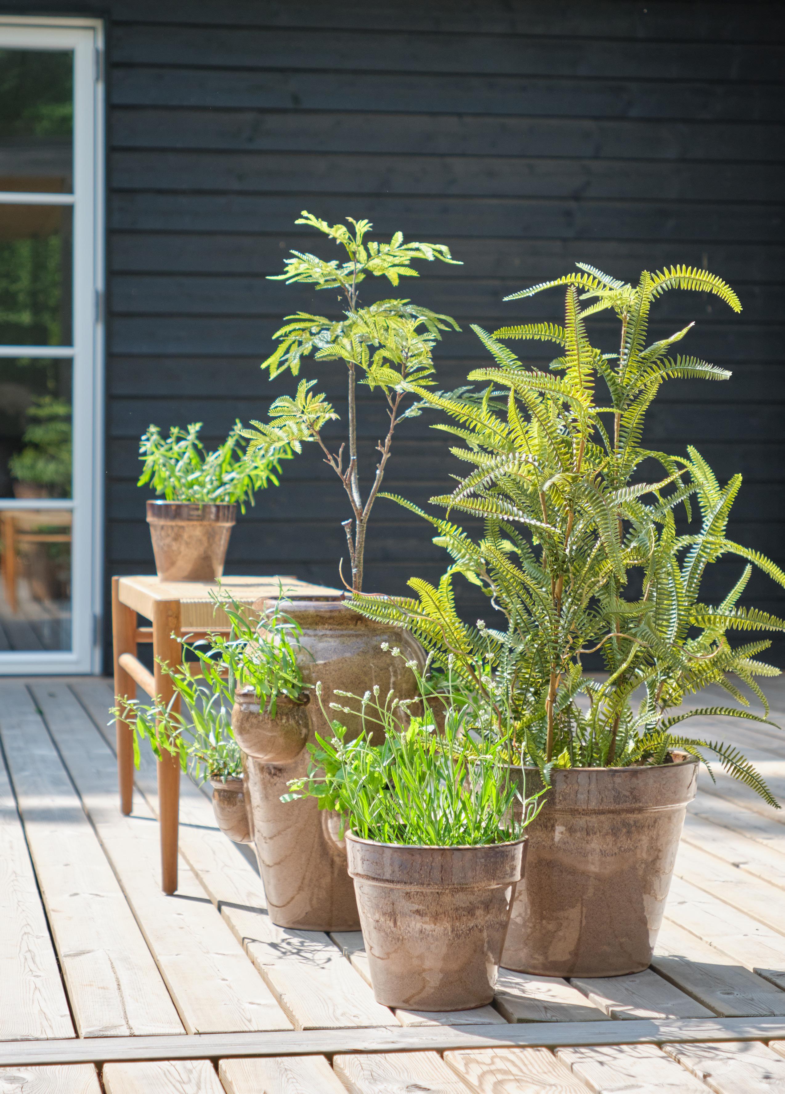 Mixing different ceramic pots with large, green plants adds atmosphere to your outdoor spaces. Play with shapes, sizes, and surfaces to create cozy corners, frame entrances, or place simple focal points in the garden.