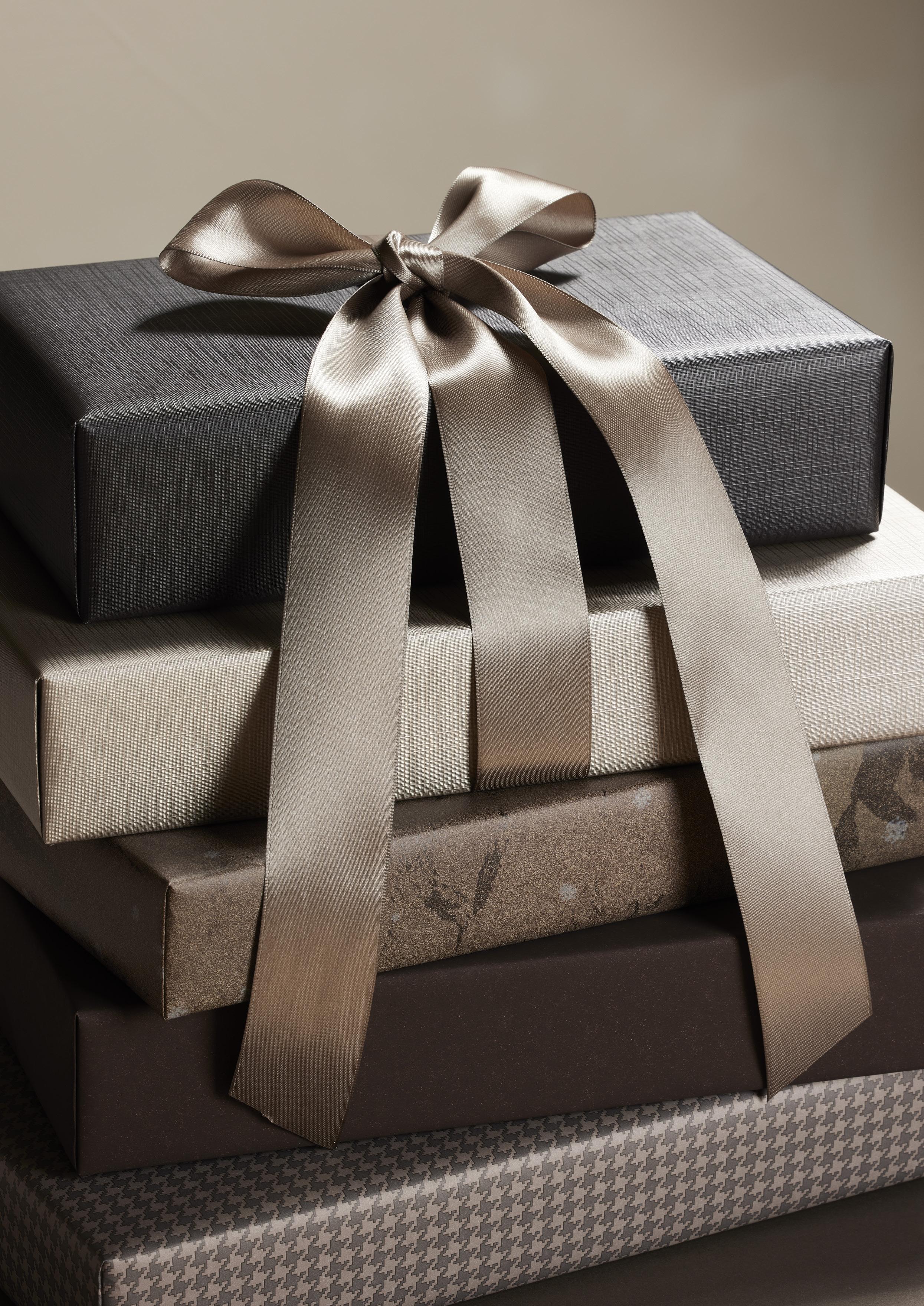 Marigold Beige (638914/638915) with a warm grey satin ribbon (724070). Underneath: Diamond Pearl cream (110633/110635).