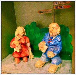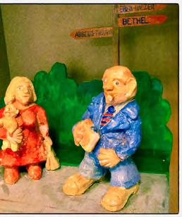 Op de schone tafels worden grote platen hardboard neergelegd waar we zometeen lekker aan het werk gaan. De gastvrouw en tevens beheerder van het gebouw komt uit de ruimte waar de kleiovens staan en stalt de pas geglazuurde potten en schalen uit. Er vormt zich al snel een kring rond de uitstalling van glimmend keramiek. Er klinken bewonderende kreten, maar er is ook soms teleurstelling. De kleur is toch anders dan verwacht of men ontdekt lelijke luchtbelletjes in het glazuur. Na deze sessie ga ik weer naar mijn vaste plek en verder met het kleien van cartooneske mannetjes.