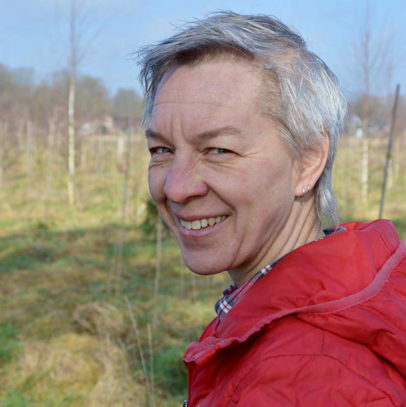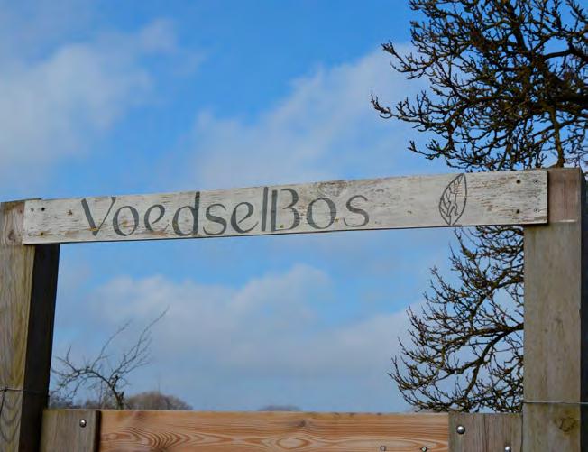 ‘Wij hebben de keus gemaakt om een ontwerp te laten maken door de landschapsarchitect Evelyn Derksen, die al meerdere voedselbossen had ontworpen. We hebben er een hek omheen gezet en een poel laten uitgraven. En nog een kleinere poel waarvan de bodem is afgedekt met folie. Daar laten we eetbare waterplanten in groeien. Ons voedselbos is een zogenaamd romantisch voedselbos. Het staat niet allemaal in keurige rijen als bij een bos die meer op productie is gericht. Bij ons bos staat het wat meer door elkaar. Het is vooral ook een beleefbos waar je nieuwe smaken kunt ontdekken. We willen gasten erdoorheen laten lopen, ze dingen te laten ervaren, verschillende kleuren en smaken, echt de niet-standaarddingen. Niet een Elstar appel, maar wel bijvoorbeeld een Veendammerglorie, een soort hier uit de buurt of een rode walnoot, gewoon omdat het kan. Om de buitenkant hebben we windhagen gezet. Aan de ene kant zwarte elzen en aan de andere kant allemaal verschillende struiken, zoals haagbeuk en hazelaar, kardinaalsmuts en sleedoorn waar wat besjes in zitten voor vogels. Die bomen en struiken hebben ook de functie om de wind tegen te houden van beide kanten omdat het hier altijd waait. Veel struiken hebben wel de behoefte aan wat meer luwte. We hebben ook grotere bomen geplant. Wat je wil is dat de bodem van grasland verandert in een bosbodem. Grasland heeft een bacterierijke bodem. De bedoeling is dat het een schimmelrijke bodem wordt. Doordat de bomen onderling met schimmeldraden voedingsstoffen uit kunnen wisselen. We brengen veel organisch materiaal op de bodem aan in de vorm van bladcompost, maar ook houtsnippers, vele kubieke meters hebben we al op het bos uitgestort.’