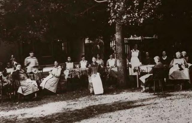 Jaren ’30 – In de tuin van paviljoen 8 (Groenehagen) op de achtergrond hekken die het paviljoen omringden. In dit pand waren onrustige patiënten gehuisvest. Gedurende de zomermaanden speelde het leven zich buiten af.