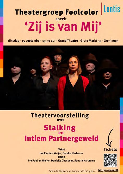 In de vorige Lentis Magazine las je al over de voorstelling Zij is van mij van onze theatergroep Foolcolor. Zij is van mij gaat over stalking en intiem partnergeweld - over liefde die omslaat in obsessie met als gevolg overmatige controle en delictgedrag. Een indringende voorstelling van 75 minuten. Wegens omstandigheden in de spelersgroep is de voorstelling verschoven naar 15 september om 19.30 uur in Grand Theatre in Groningen.