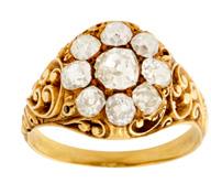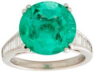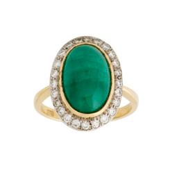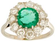 Antique, centring a claw-set vivid green round emerald weighing approximately 2.00 carats, surrounded by eleven claw-set old-cut round diamonds to a raised shoulder and rounded band, size O, gross weight approximately 5.0 grams.