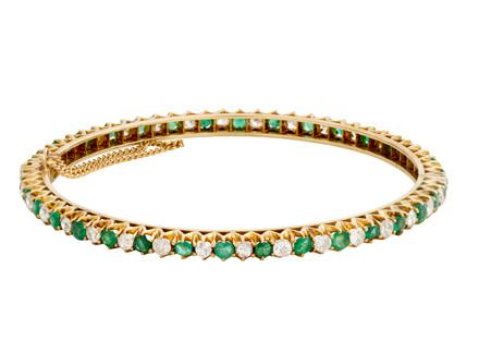 A round hinge bangle of alternating claw-set oval cut emeralds and old-cut round diamonds to a box clasp with safety chain, the diamonds together weighing approximately 1.02 carats, internal diameter approximately 155mm, gross weight approximately 13.4 grams.