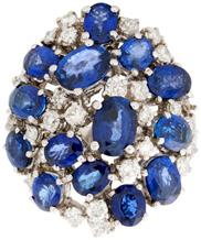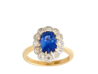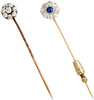 Two lapel pins in floral cluster style, one centring an old-cut round diamond surrounded by a cluster of old-cut round diamonds, the second centring a clawset round sapphire surrounded by a cluster of old-cut round diamonds, the diamonds together weighing approximately 2.72 carats, gross weight approximately 6.5 grams.