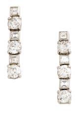 Each comprising seven claw-set round brilliant-cut diamonds flanked by five claw-set baguette-cut diamonds to a post and clip, the diamonds together weighing approximately 6.00 carats, length approximately 25mm, gross weight approximately 10.0 grams.