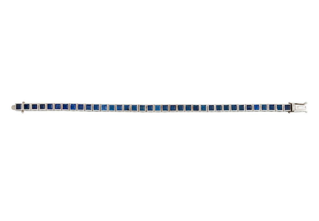 Comprising graduating satin flexible panels with polished edges, pinched towards the centre with a detail knot feature of curved textured bars, claw-set with round sapphires to an integrated clasp and length approximately 190mm, gross weight