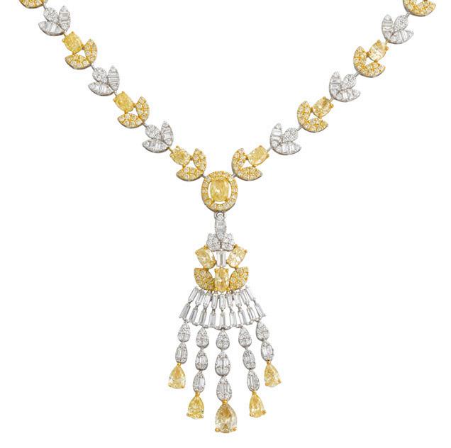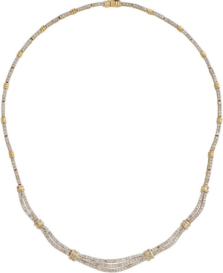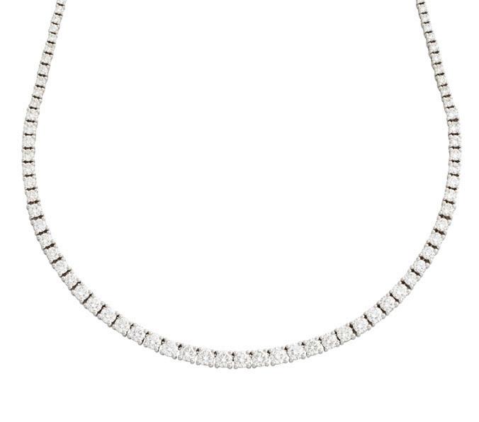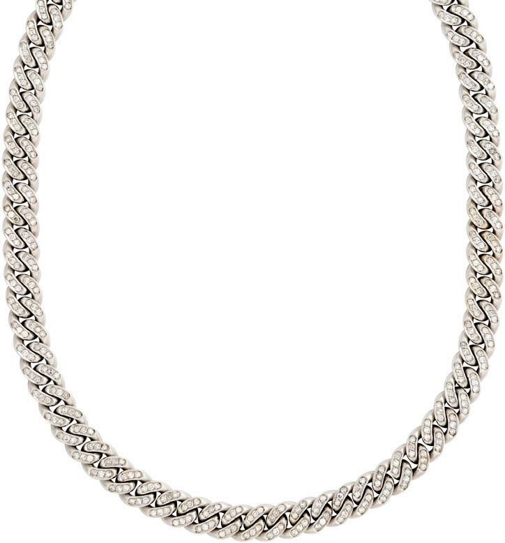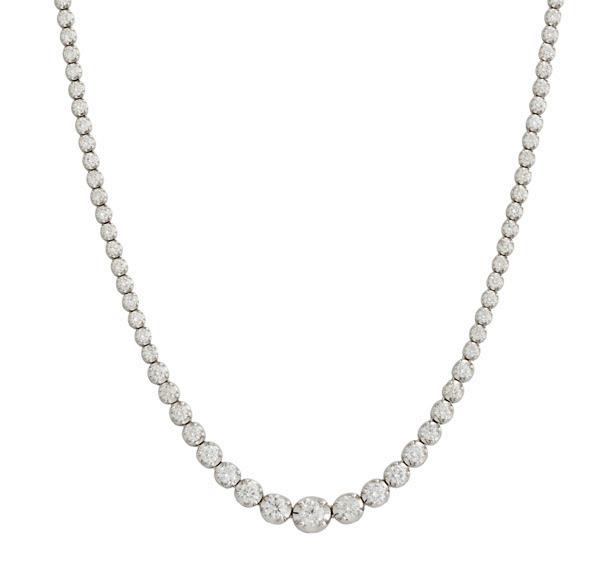 Centring two claw-set round brilliant-cut diamonds each weighing approximately 1.00 carat, styled in a chevron design with flexible links flanked by a line of thirty-six round brilliant-cut diamonds graduating from the centre with four baguette-cut diamonds to the terminals with an integrated clasp and clip, the diamonds together weighing approximately 20.92 carats, length approximately 190mm, gross weight approximately 69.5 grams.