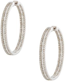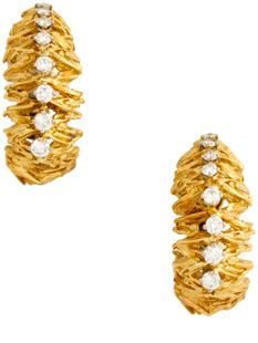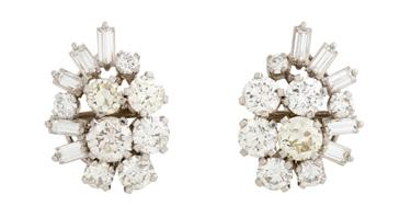 Each comprising a half hoop of front-facing diamonds as two rows of claw-set round brilliant-cut diamonds with a centre row of end-set baguettecut diamonds, to a post and an integrated clip, the diamonds together weighing approximately 2.50 carats, inner diameter approximately 37mm, width approximately 4.33mm, gross weight approximately 16.0 grams.