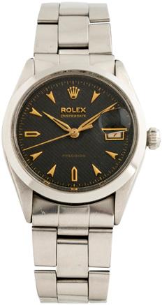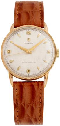 Dial: champagne, applied baton hour markers, pointed baton hands, centre seconds, date aperture at 3