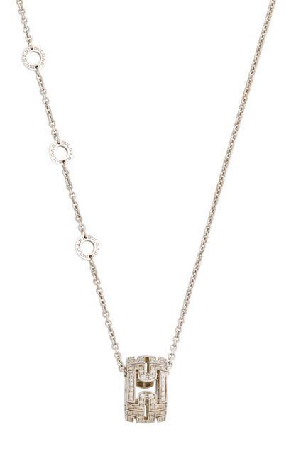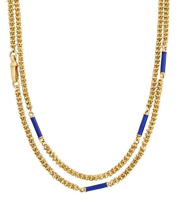 Comprising satin textured square serpentine links with polished edges as a single strand to the rear, with side decorative details suspending a second strand to the front with a push clasp and clip, length approximately 410mm, gross weight approximately