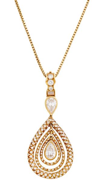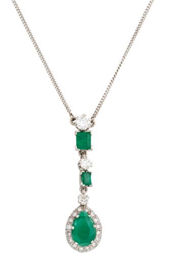 Centring one claw-set pear-cut emerald surrounded by sixteen round brilliant-cut diamonds with millegrain edge suspended from alternating clawset round brilliant-cut diamonds and emerald-cut emeralds in articulating links, the diamonds together weighing approximately 1.15 carats fixed to a curb link chain with extender to a bolt ring clasp, length approximately 470mm, pendant length approximately 50mm, width approximately 15mm, gross weight approximately 8.8 grams.