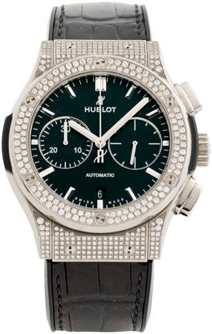 Closure: Omega integrated green leather racing strap and maker’s buckle