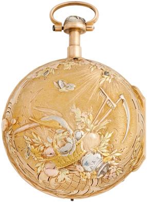 Case: polished round curve case with back secured by seven screws, diamond and coloured gemstone set bezel, no. AEP 63G