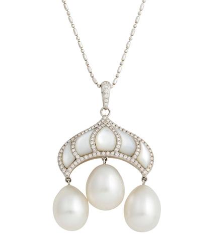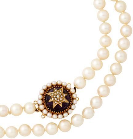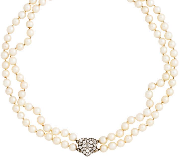 A double strand of cream coloured cultured pearls of uniform size to a pavé-set diamond heart pendant, length of strands approximately 400mm and approximately 430mm, gross weight approximately 51.2 grams.