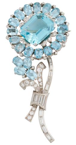 Of foliate design, the brooch centres a claw-set aquamarine off-set to the surrounding petals of twenty oval-cut aquamarines with thirty claw-set single cut diamonds in folia motifs and four further oval-cut aquamarines as buds with a stem of channel-set baguette-cut diamonds and grain-set diamonds to a roller pin, length approximately 80mm, width approximately 40mm, gross weight approximately 25.3 grams.