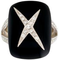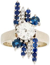 Centring a claw-set round sapphire on a mid-century design of layered open-work textured bars, claw-set with six round brilliant-cut diamonds to a tapering band, the diamonds together weighing approximately 0.18 carats, size Q1/2, gross weight approximately 12.0 grams.