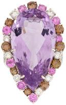 Centring an oval sapphire with radiating satin sprays set with five claw-set round brilliant-cut diamonds, sapphires and one tanzanite, the diamonds together weighing approximately 0.30 carats, width approximately 65mm, gross weight approximately 20.4 grams.