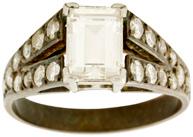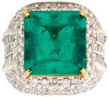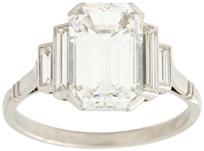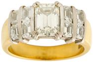 Centring a claw-set emerald step-cut diamond flanked by four further step-cut baguette-cut diamonds size M1/2, gross weight approximately 10.0 grams.