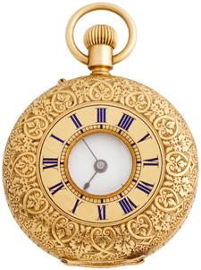 Dial: gilt, applied dart hour markers concealed beneath a sapphire and diamond-set flowerhead hinged cover