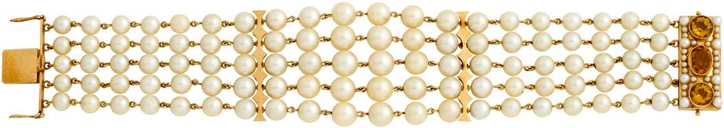 Composed of five strands of cultured pearls completed by a citrine and pearl box clasp, length approximately 185mm, gross weight approximately 59.5 grams.
