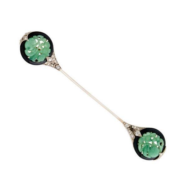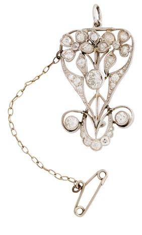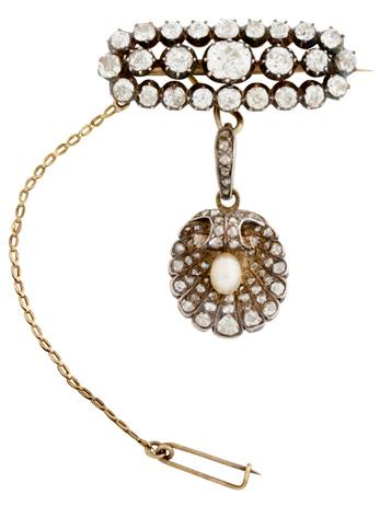 Centring two claw-set old-cut diamonds each weighing approximately 2.40 carats and 2.32 carats, aside a cluster of two claw-set round old-cut diamonds and one old-cut cushion cut diamond, to a bar of channel-set round old-cut diamonds with a filligree openwork mount to a pin and catch, with a total diamond weight of approximately 6.40 carats, length approximately 80mm, gross weight approximately 8.0 grams.