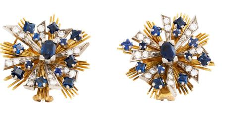 Each comprising a starburst centring a claw-set oval sapphire surrounded by a spray of claw-set sapphires and diamonds to yellow gold sprays with a further eight sprays of claw-set round brilliant-cut diamonds to a post and european clip, width approximately 35mm, gross weight approximately 26.4 grams.