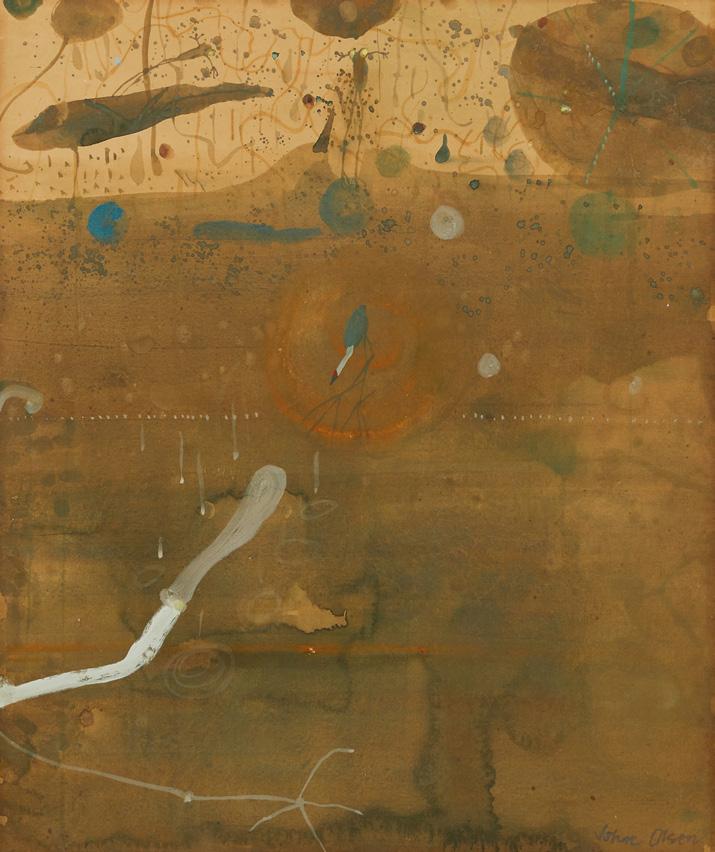 Pond in Rain watercolour on card signed lower right: John Olsen titled on frame verso
