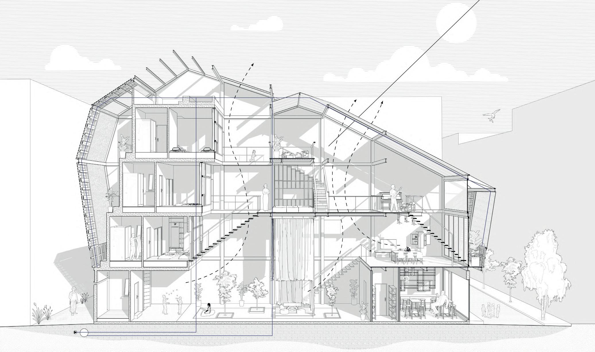 Lo studentato, invece, si articola in due ali che abbracciano un cuore pulsante di spazi comuni. Qui, le vite si intrecciano in un gioco continuo tra privato e collettivo, tra riflessione e interazione. L’architettura si fa fluida, dissolvendo i confini, creando un luogo dove ogni angolo invita al dialogo e alla connessione.