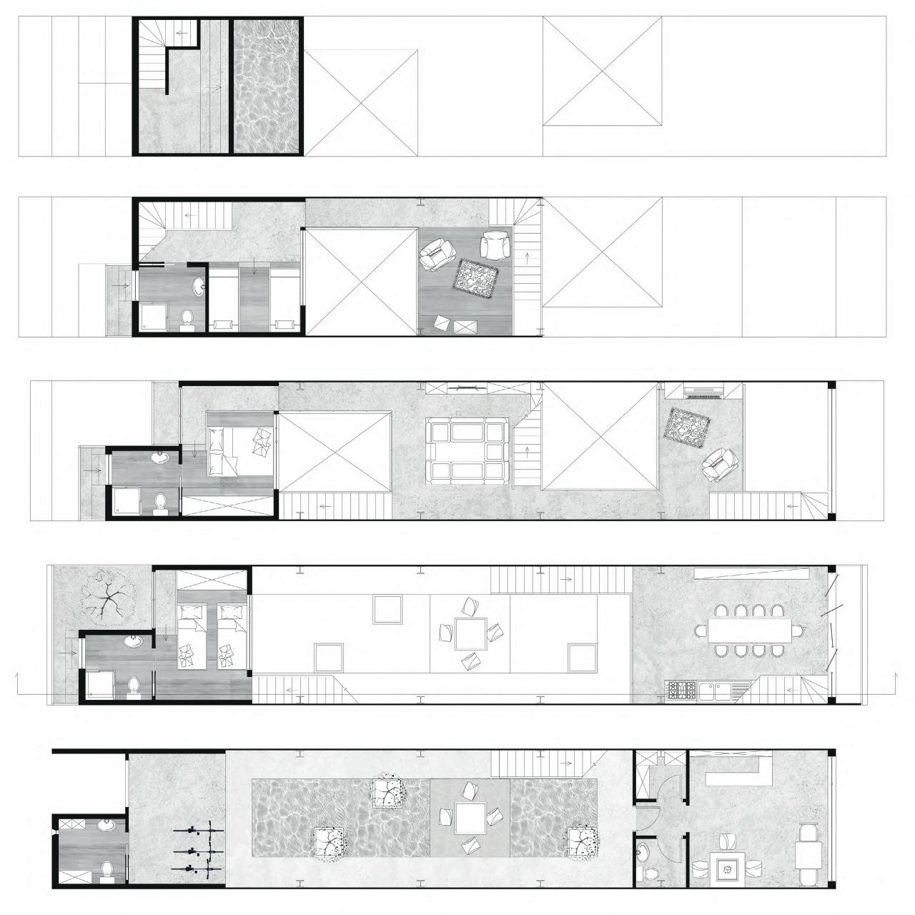 The internal spaces, open and airy, are stamped by multiple differences in level that give movement to daily transit