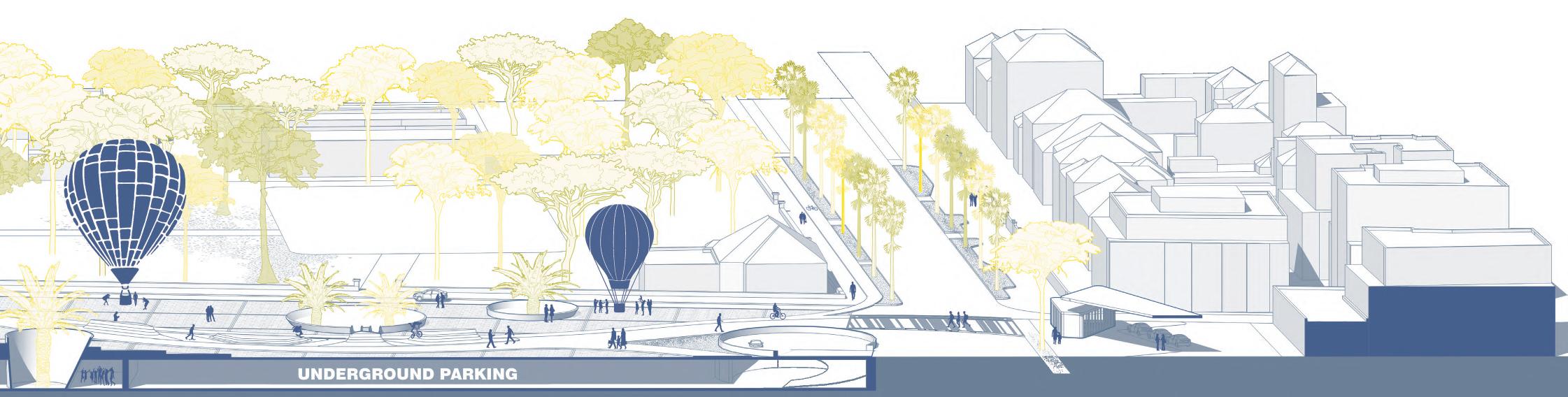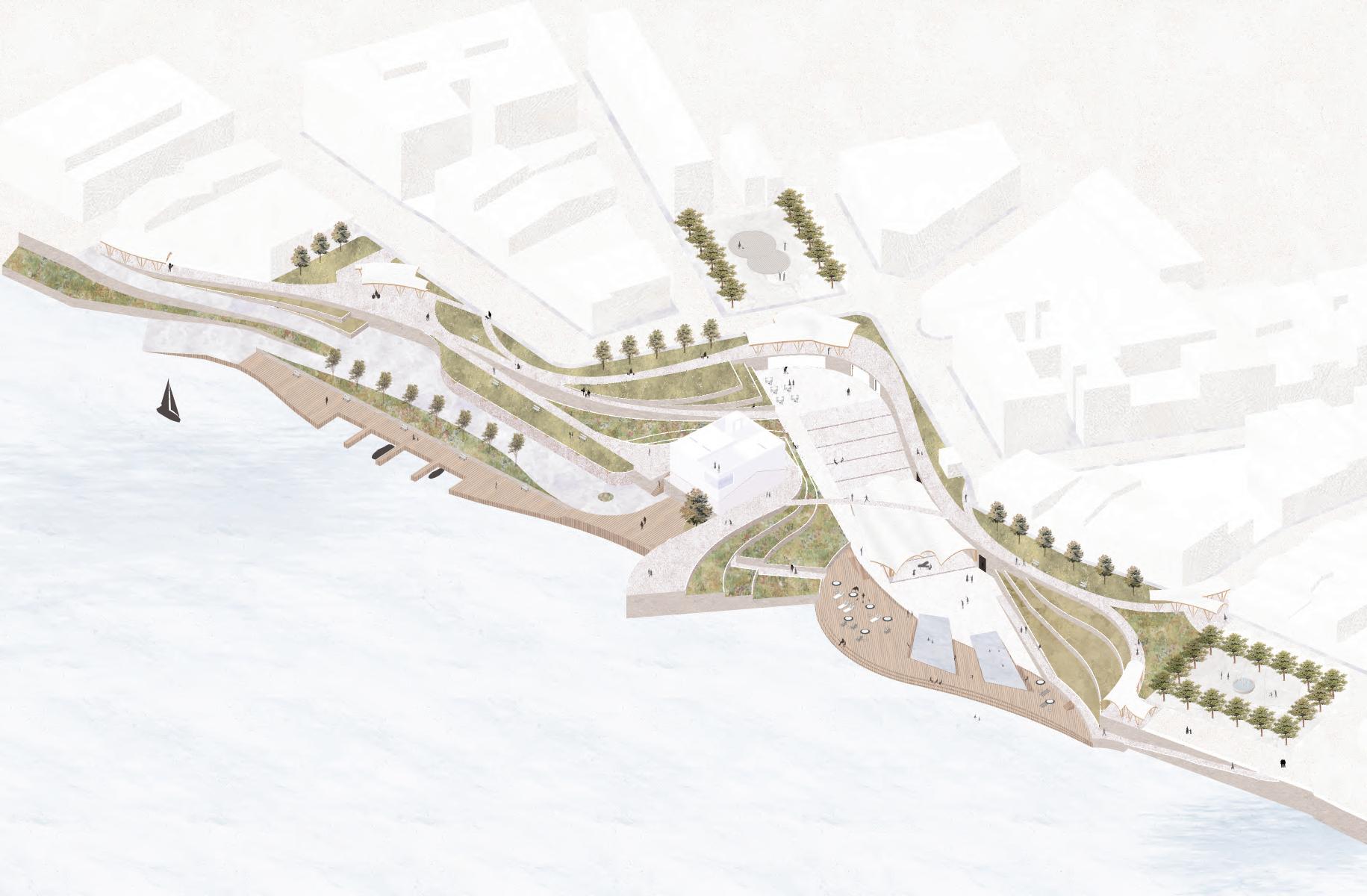 As gateways to the garden, wooden and white ceramic structures frame the main perspectives and connect the park to the city. Beneath the main pathway, a restaurant, public changing rooms, and a materials depot find their place, blending functionality with the new natural landscape.