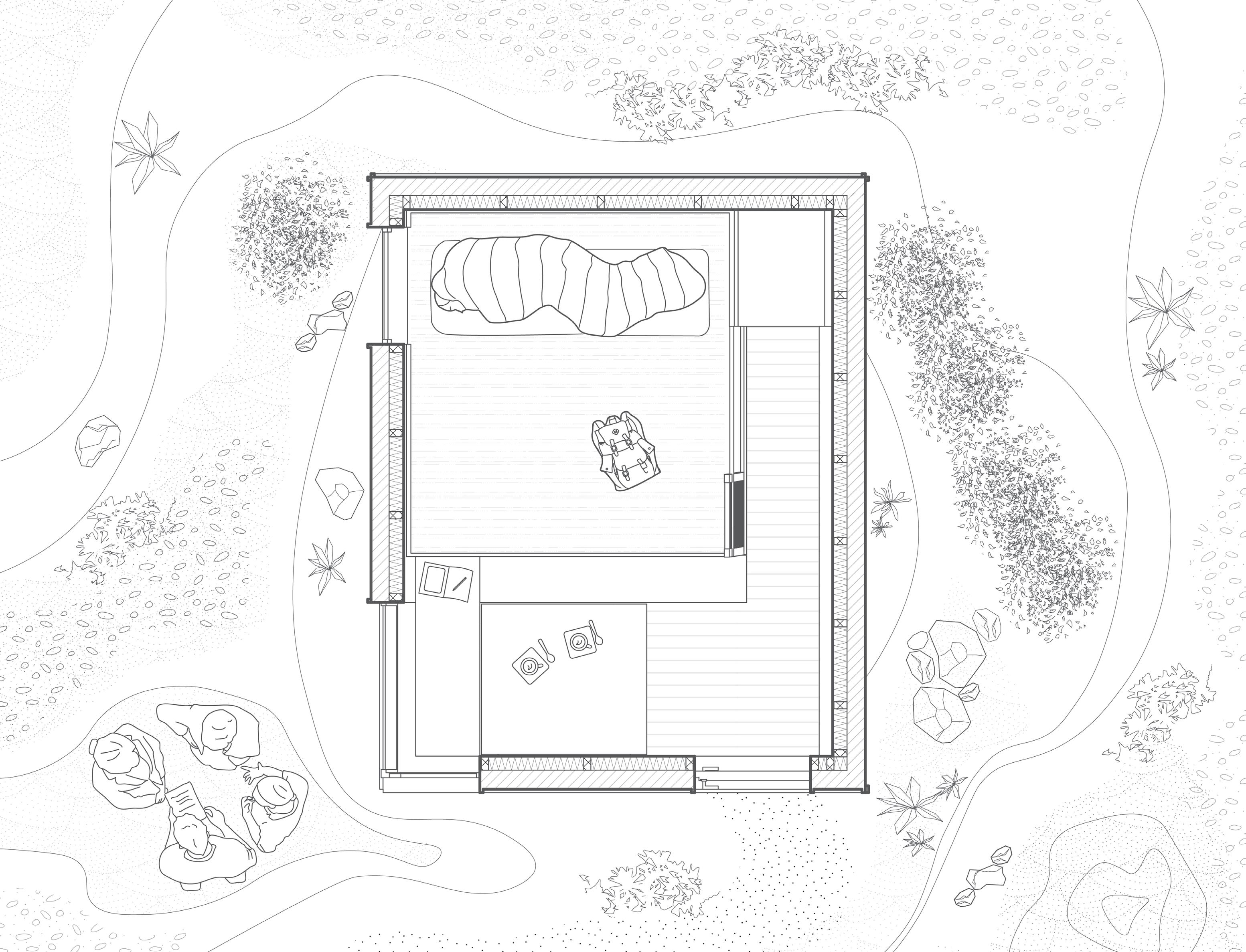 The sleeping areas develop by overlapping in a staggered manner, leaving space for vegetation externally