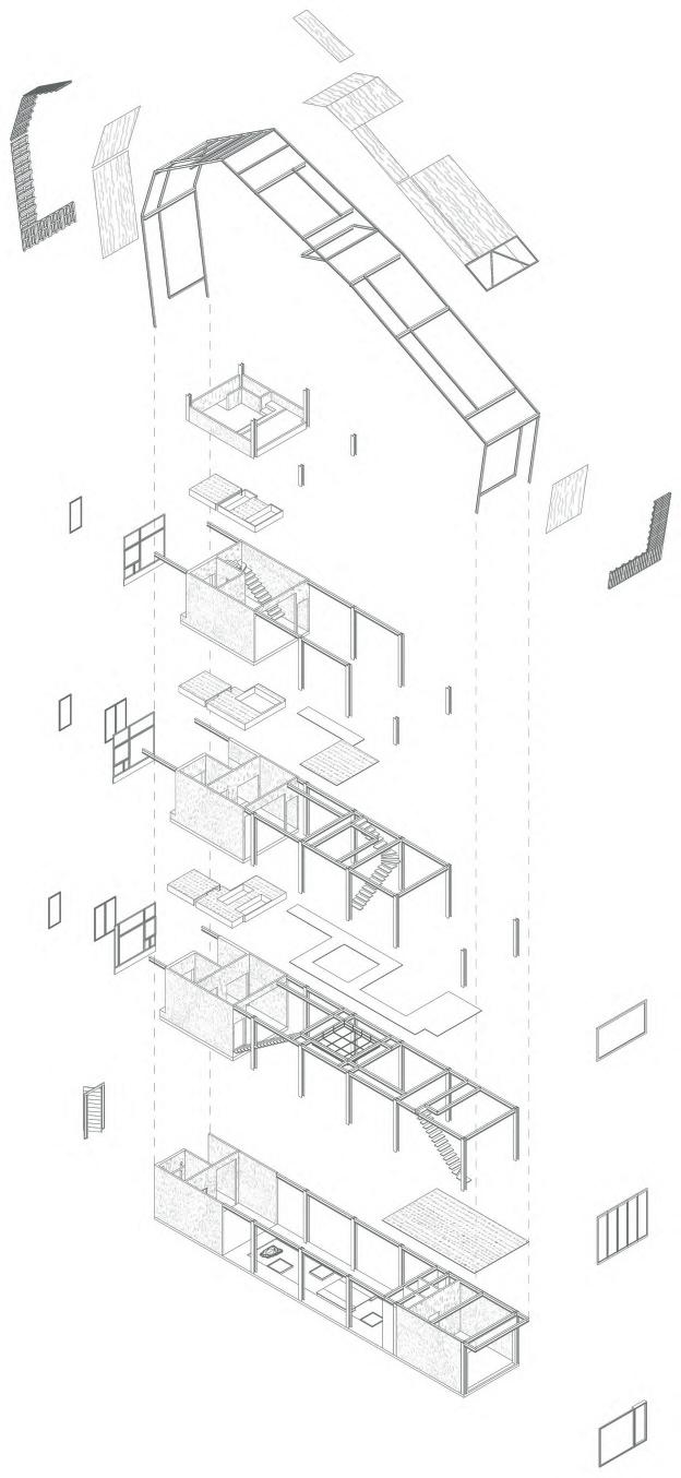 The entire house is protected by a shell, made up mostly of a double frame of bamboo with a filtering function