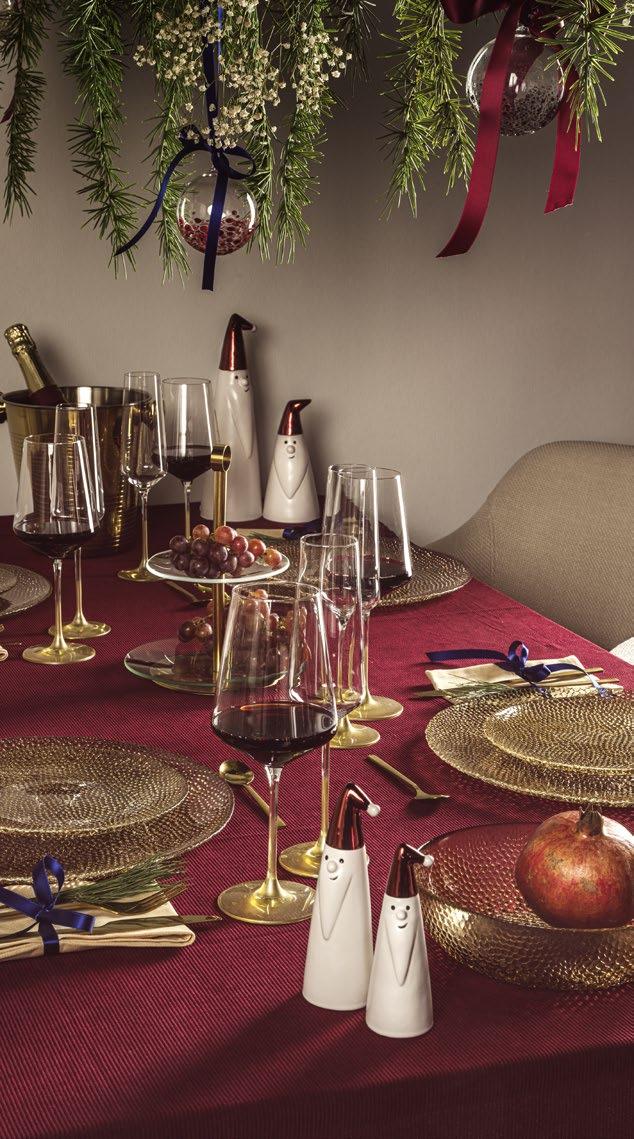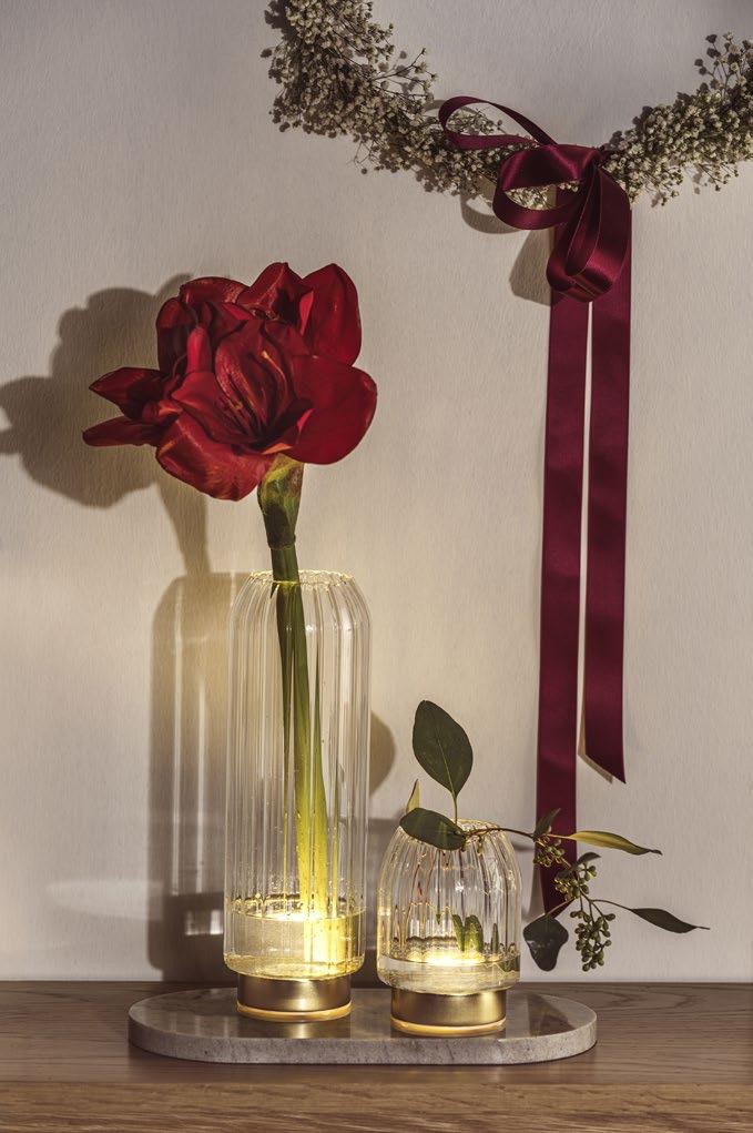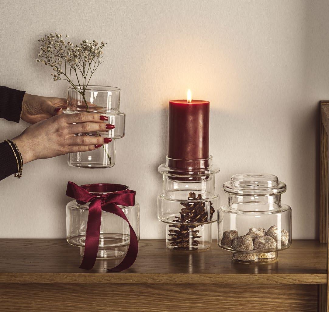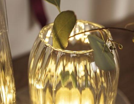 Les boîtes en verre modernes apportent une touche légère, tout comme les photophores lumineux et les étagères pratiques. Le design épuré met en valeur la lumière des bougies, le vert des sapins et les petits rituels qui rendent cette période si particulière. Les pères Noël et les figurines de cerfs ludiques ou les vases LED puristes à structure cannelée avec un socle doré constituent des pièces maîtresses. Pour une table joliment dressée, des verres à champagne et à vin dorés ainsi que des assiettes et bols bruns à la texture tactile complètent l’ensemble.