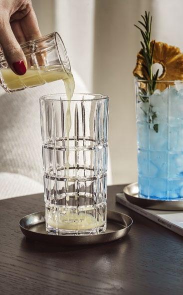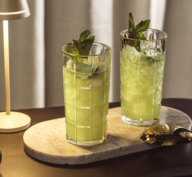 La structure en carreaux gravés de manière concise ne se contente pas d'affirmer un design fort et facilement reconnaissable, elle sert également de repère intuitif pour le remplissage. En effet, les rainures horizontales correspondent à différentes quantités en cl et permettent ainsi de préparer des boissons avec précision et sans effort. En même temps, le verre de haute qualité séduit par sa brillance visiblement supérieure et offre une sensation particulièrement agréable en bouche grâce à son nouveau bord arrondi.