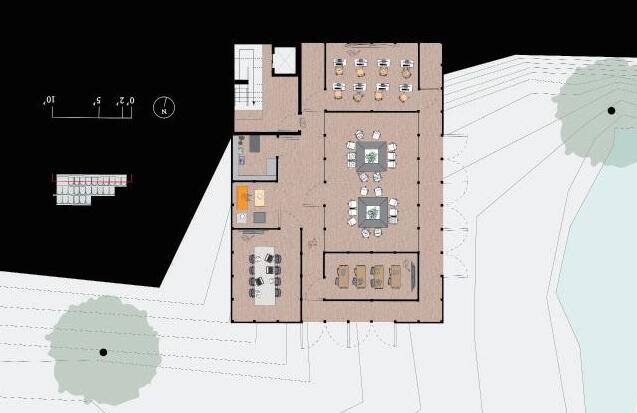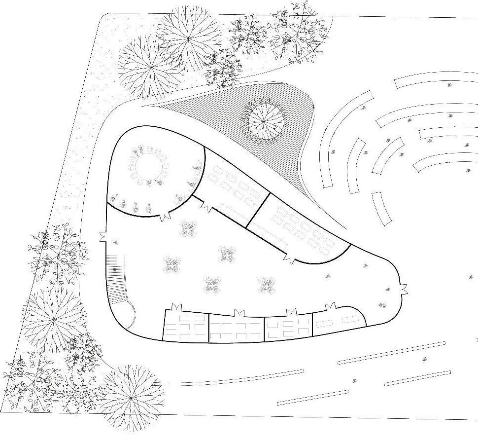 The foot print of the houses in the Inhabitating Wall project avoid to take place the trees on the site. The public space is surrounded by the trees and houses, to create a secret space only for the cummunity. and there will be some benches(For childen and adults) and diaplay board(For works show) which make the sense of horizontal flow corresponding to the walls. The public space is a park inside the community to bond the families together.