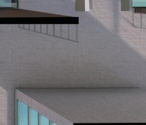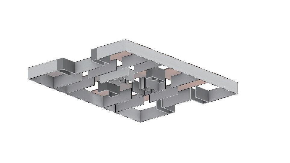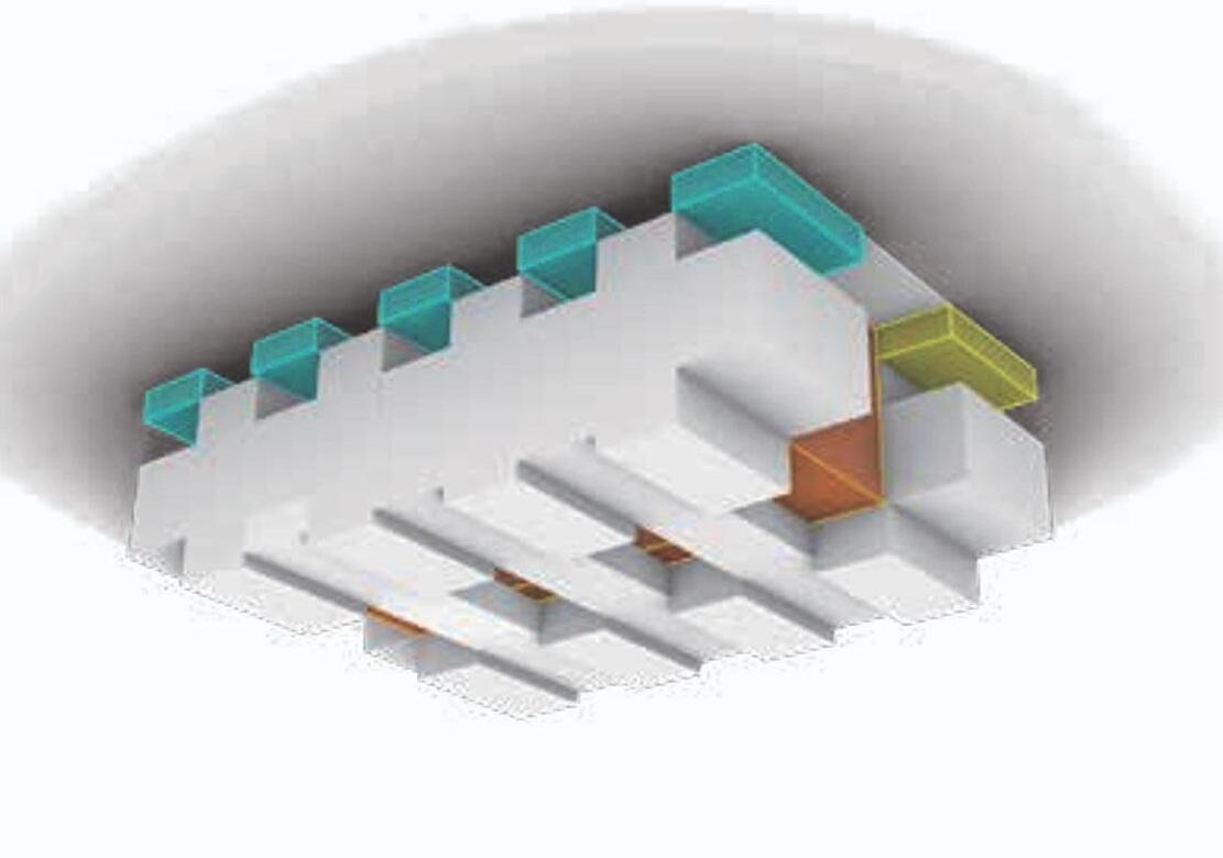The borders of these pathways are defined by horizontal walls. Using a variety of heights and density with these walls, the program is organized, and the various levels of privacy are created.