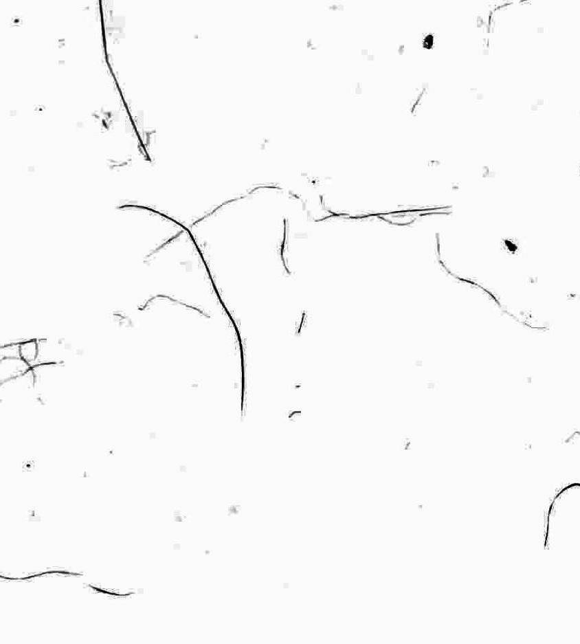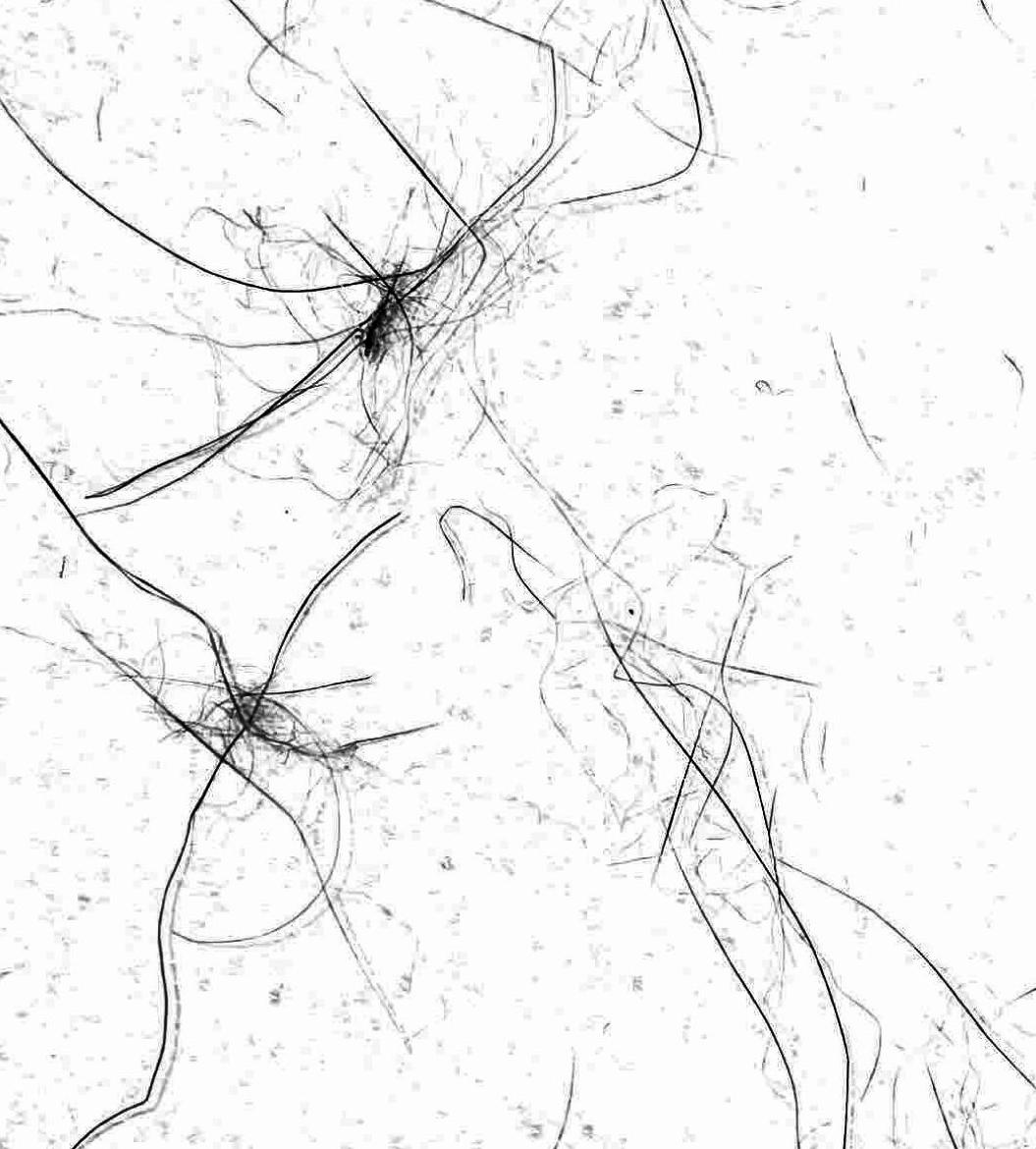 Individually, the extracted fibers are linear and tubular, the length varies but ranges from on average 1-6cm. They are ordered more un-uniformly with twists and curves all manners of direction.