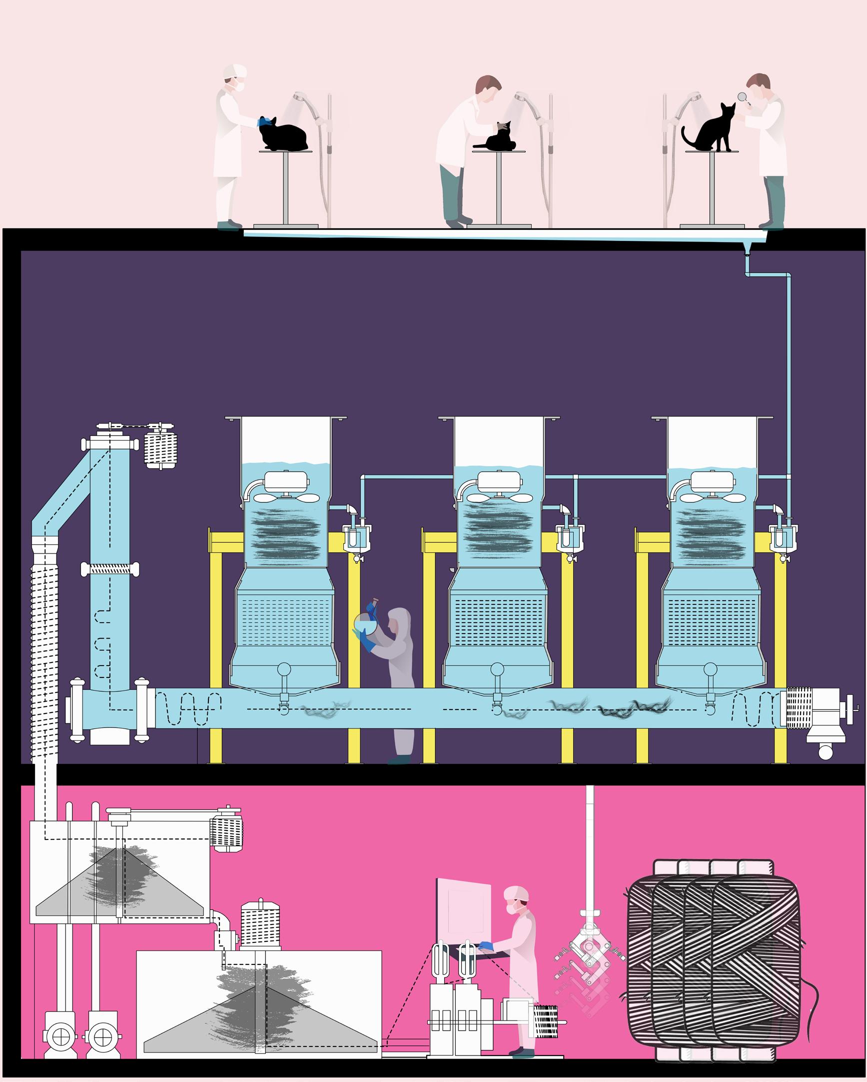 This project draws inspiration from the material study of cat hair and my understanding of biology. In this cat-worshiping society, cats and their fur are regarded as the most precious resource in the world. Following an apocalyptic event, both humans and cats now live underground, enduring constant cold temperatures and surviving on a strict diet of fish. While cats can freely roam beyond the city limits due to their superior biology, humans are confined indoors, venturing outside only when absolutely necessary. Scientists in this society are deeply invested in researching and experimenting with cat hair due to its remarkable cellular properties. As a fibrous additive in building materials, cat hair offers exceptional tensile strength and insulation capabilities. These qualities hold great potential for expanding the city further underground, should returning to the surface prove impossible. Additionally, researchers are exploring the use of cat hair to develop heat-resistant clothing, enabling humans to venture farther into the frozen wasteland that surrounds them.