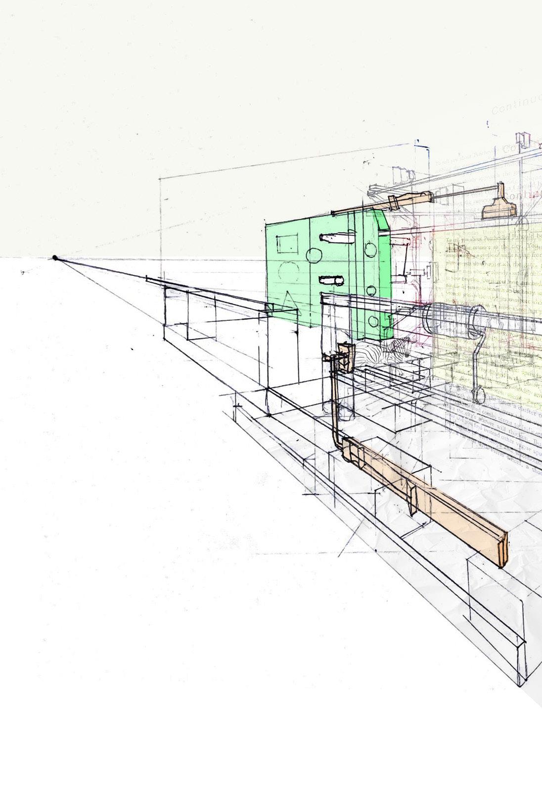 Figure 4. Perspective composition of the Machine for Reincarnation via layering and palimpsest.